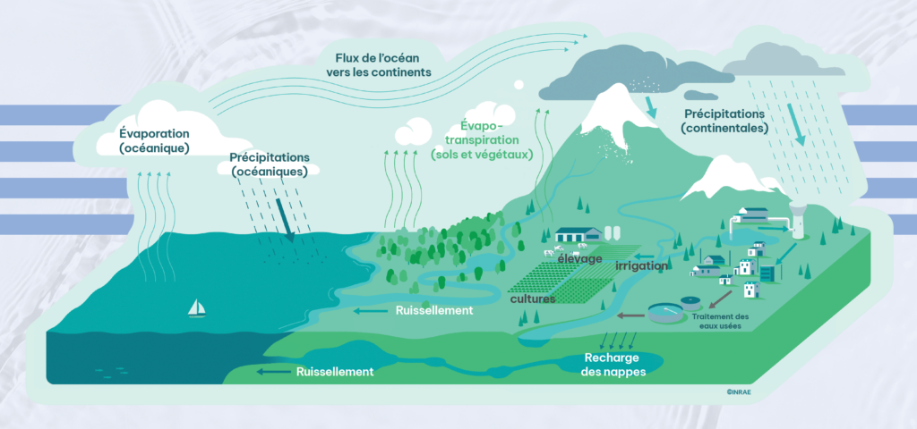 L’eau suit un cycle naturel, appelé le grand cycle de l’eau : elle s’évapore, forme des nuages, retombe sous forme de pluie et alimente les sols, les rivières et les nappes souterraines.